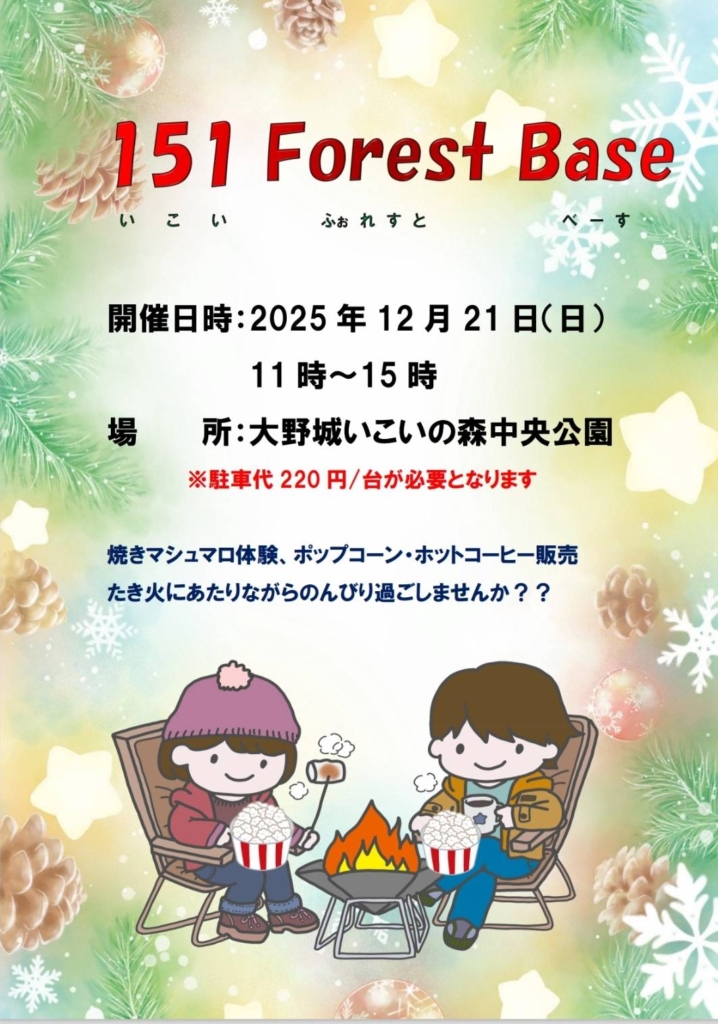 11/16(日)11時~15時、大野城いこいの森中央公園で151ForestBaseイベントを開催します!今回は焼きマシュマロ・ホットコーヒー・ポップコーンです。みなさまのご来場をお待ちしています。 -